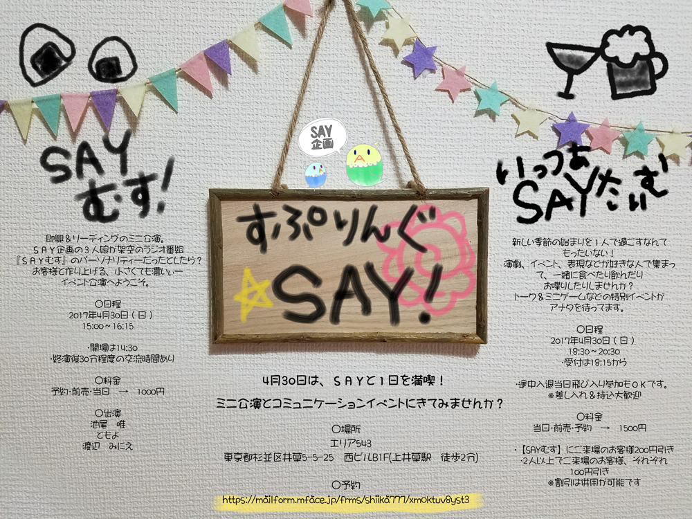 すぷりんぐSAY 2017/04/04 すぷりんぐSAY! 『すぷりんぐSAY!』 4月30日は、SAYと1日を満喫! ミニ公演とコミュニケーションイベントにきてみませんか? どちらのイベントも、会場と予約は↓コチラ↓〇場所 エリア543 東京都杉並区井草5-5-25 西ビルB1F 上井草駅 徒歩2分〇予約https://mailform.mface.jp/frms/shiika777/xm0ktuv8yst3 ―ミニ公演―【SAYむす】 即興&リーディングのミニ公演。 SAY企画の3人娘が架空のラジオ番組『SAYむす』のパーソナリティーだったとしたら? お客様と作り上げる、小さくても濃いぃーイベント公演へようこそ。〇日程 2017年4月30日(土) 15:00~16:15(予定) ・開場は14:30 ・終演後30分程度の交流時間あり〇料金予約・前売・当日 → 1000円(1ドリンク付き)―バラエティ&コミュニケーションイベント―【いっつぁSAYたいむ】新しい季節の始まりを1人で過ごすなんてもったいない!演劇、イベント、表現などなどが好きな人で集まって、一緒に食べたり飲んだりお喋りしたりしませんか?トーク&ミニゲームなどの特別イベントがアナタを待ってます。〇日程 2017年4月30日(土) 18:30~20:30 ・受付は18:15から ・途中入退場OK○内容・コミュニケーションゲーム・トーク&軽食・イベント参加者のCMタイム 当日飛び入り参加もOKです。 ※差し入れ&持込大歓迎〇料金 1500円(当日受付にて清算) ・ミニ公演にご来場のお客様200円引き ・2人以上で同時にお申し込みまたはご来場のお客様、それぞれ100円引き ※割引は併用が可能です―連絡先―電話・FAX 03-6426-8085(制作:表現集団ATP)郵送 〒142-0053 東京都品川区中延4-21-11 パールハイツ105 SAY企画メール say_info@yahoo.co.jp(SAY企画)公式ブログ http://say.o-oi.netツイッター @saykikaku