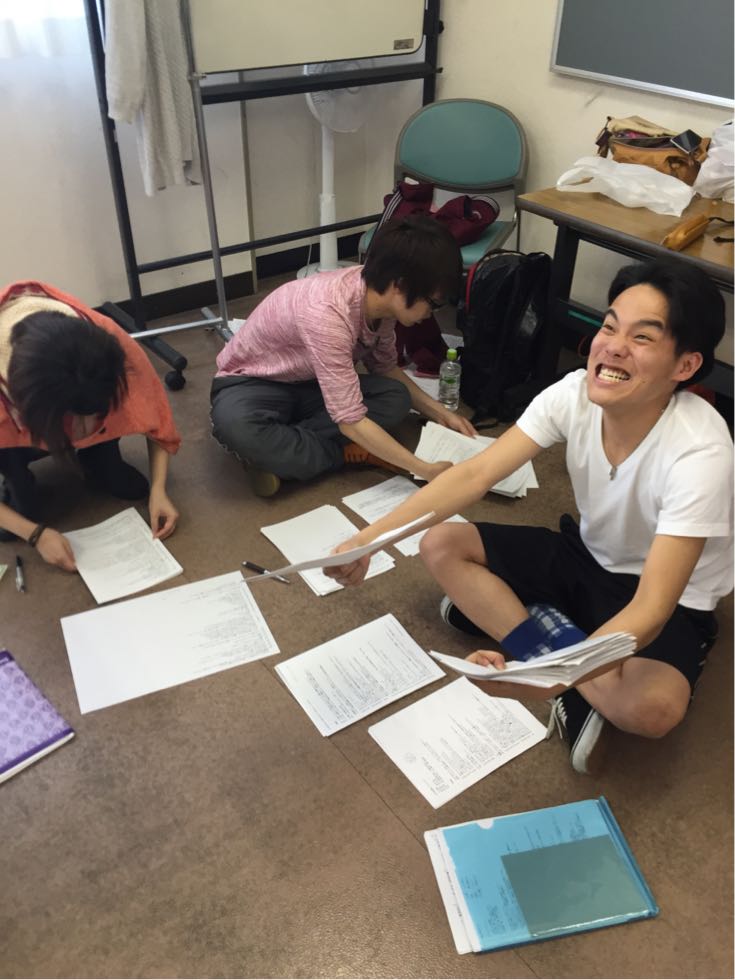 めぐる・あ・りうむ 2015/05/05 再びの稽古の一コマ。 どうも皆様おはこんばんにちは(*´ω`*)SAY企画ブログ担当、鵜飼です!今回も進み行く【めぐる・あ・りうむ】の稽古風景をお届けして参りますですよー( °ロ°)毎度楽しげな雰囲気で進むSAY企画の稽古。もちろんちゃんと内容も進んでます!勉強熱心な、ハマさんこと新濱卓さん!今回なんだか台詞量が尋常じゃないらしいですよー?笑いやー、とっても真面目で真っ直ぐで良いお兄さんです。最近ハマさんとの下ネタトークが増えて鵜飼はとても楽しいです!!( `・ω・´ )キリッこちらは脱力系男子、こうちゃんこと石原功助さん!普段はぷにっと脱力系でも芝居のパワーは凄いですー、鵜飼圧倒されっぱなし。だからね、楽しい!!( `・ω・´ )キリッ今回はハイテンションでお客様と共にいろんな謎と困惑を乗り越えていくかも?笑あ!イケてるお兄さん発見!!しゅーさんこと高森修平さんです!衣装候補をお持ちいただいたようですよー!ん?あれは…?値札つきっぱなしィィイイ!購入場所モロばれ!笑イケてる中にも抜けを作るあたり、この人は良いイケメンです、鵜飼が保証します( `・ω・´ )キリッそして、鵜飼がカメラを向けると必ず何かしらアクションを起こしてくれる、彼。今回のSAY企画の最年少、かわちゃんこと川竹達也さん!彼の面白い動きは私のツボを結構な確率でクリティカルヒットしてきます、恐ろしい子…((( ゚д゚ ;)))今回は不思議な立ち位置と睨めっこしながら取り組んでくれています!若さゆえのエネルギッシュな部分も楽しんでいただけるかと!( `・ω・´ )キリッそしてそしてちょっぴりだけど、ごめんなさい今回こんなショットしかなかった…_(:3」∠)_膝の猫を見ているのかはたまた別のやましい目的か。遊び心満載の面白い人、たしまさんこと田島謙太さん!(そのまんまか!)今回結構なギャグセンの高さを披露してくれそうな予感だ!彼の手元は黒く染まるかもしれない…!( `・ω・´ )キリッもっともっと紹介したい人はいっぱいですし、これだけの紹介では物足りないので、次回からは役者紹介にしたいと思います(*´ω`*)一人一人ピックアップしていきますよー!うおおおお俺のiPhoneカメラが唸るぜぇぇぇえええええ!(‘д‘⊂彡☆))Д´)パーンはい、落ち着きますね。ではでは次回からの役者紹介、乞うご期待!ヾ(●´ω`●)ノ