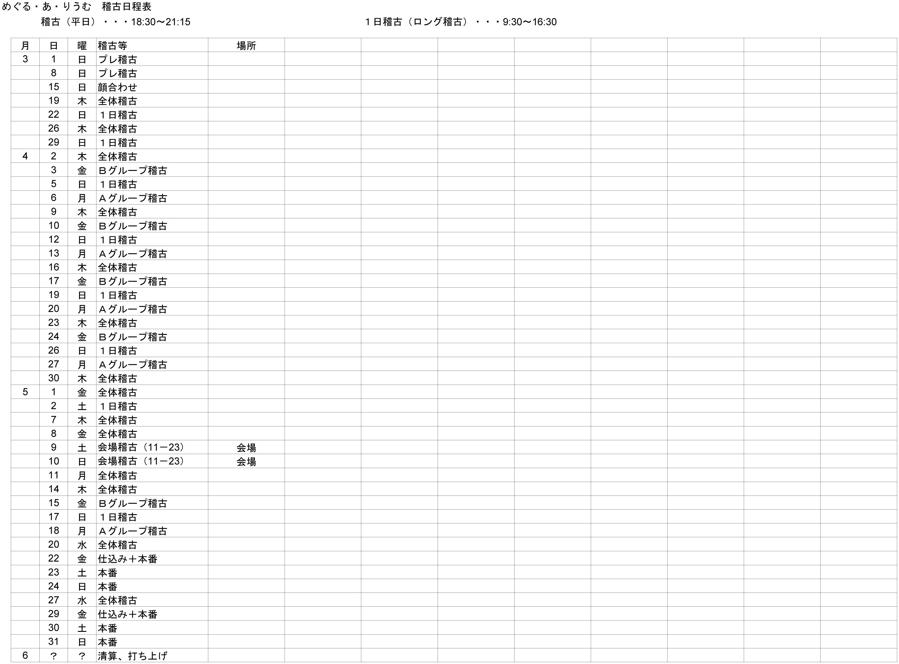 めぐる・あ・りうむ 2014/12/04 2015年公演、キャスト募集! SAY企画では、2015年5月に行う公演のキャストを募集しております。私達と『SAYしたいアナタ』のご応募、お待ちしております。 ・・・・・・・ SAY企画vol3 [めぐる・あ・りうむ] 【キャスト参加者募集】 〇〇な性格の××座、△座と◇座は相性抜群― 星占いでお馴染みの12星座をモチーフにした12の物語のものがたり。 ―応募― 参加をご希望の方は、必要事項を記入の上、下記連絡先までご応募ください。 ご質問やご相談などある場合も、同じ連絡先までお問い合わせください。 〇応募期間 2014年12月1日~2015年2月4日(必着) 〇オーディション ・日時 ① 2015年2月6日(金) 19:00開始 ② 2015年2月7日(土) 14:00開始 ☆受付は開始の15分前 ☆どうしても日程が合わない場合は、可能であれば個別に対応いたします。 ・場所 東京都品川区内公共施設(応募者にのみ通知) ・参加費用 500円 〇募集人数 男女合わせて9名 ・募集とは別に決定しているキャストが4人おり、合計で13人で上演します ・決定済みのキャストは主催団体出演者です 〇応募から合格までの流れ ・参加希望の旨を、下記連絡先までご応募ください。 おってこちらからオーディションに関する詳細をお送りします。 ・オーディション(参加費は当日お支払いください) ・オーディションから数日以内に、合格者に連絡し、参加の意思を最終確認 ・必要に応じて顔合わせなどを行った上で、正式に合格 ―役者条件等― ・チケットノルマ 15枚 ※不足分は公演後、清算会にて清算 ・チケットバックあり ノルマ(15枚)越え1枚につき50%(1100)円バック ※リピーター割引の場合などは、0.5枚分換算 ・デポジット(預り金)1万円を顔合わせまでに納付。公演終了後反省会にて返却 ※ノルマ未達成時、デポジットにて清算 ・稽古に8割程度は参加できること ・スタッフワークを含む企画に協力してくれること ―必要事項― 氏名(本名)、芸名、フリガナ、性別、年齢、芸歴(受賞歴、出演歴、学歴)等、所属事務所・団体、連絡先(電話・メール)、 オーディション希望日(とくになければ『全て』も可)、参加理由、特記事項、 〇添付 ・本人写真(バストアップと全身。ご本人のみ映っていれば、種類や背景は問いません) ・他、ボイスサンプルや出演作品(データの送信または閲覧視聴可能なURL可)など参考として提出したいもの 原則として頂いた資料の返却はいたしません。 複製が難しいものは送付せず、コピーなどをお送りください。 ―公演概要― 【めぐる・あ・りうむ】 〇日程 2015年 5月22日(金)A 23日(土)B+A 24日(日)A+B 29日(金)B 30日(土)A+B 31日(日)B+A 6日10回公演(各回25席~30席予定) ※金曜日は、仕込み+公演 ―補足― ・公演は、A公演とB公演で2種類あり ・それぞれ共通のOPとED(全員出演)があるが、演目は公演ごとに違う ・AB両方の話に出る役、Aのみ出る役、Bのみ出る役の3種類 〇場所 『兎亭』 東京都練馬区旭丘1ー46ー15 金建ビルB1 最寄り:西武池袋線 江古田駅 徒歩5分/都営地下鉄大江戸線 新江古田駅 徒歩10分 〇料金 予約・前売→2200円 当日→2500円 リピーター→1100円 〇公演時間 A公演 3本~4本 90分~100分(予定) B公演 3本~4本 90分~100分(予定) ―でてくる人(仮) ・ストーカーカメラマン ・性同一性障害? の双子 ・ガメツイ占い師 ・先生と呼ばれる幽霊 ・ポジティブ女社長 ・ネガティブ葬儀屋 ・コスプレ何でも屋 ・貢がせ系悪女 ・元社畜 ・騙されイケメン ・2ちゃんねらー主婦 ・貧乏プラネタリウム館長 ―スケジュール― 12月 キャスト募集開始 2月 オーディション 合否通知(必要に応じて事前確認等) 仮台本配布 3月 顔合わせ 5月 本番 6月 清算、打ち上げ 〇稽古について 3月中旬より開始 ・Aグループ稽古(夜) 月曜日 ・Bグループ稽古(夜) 金曜日 ・全体稽古(夜) 木曜日 ・全体1日稽古(朝夕) 日曜日 ※稽古日程(予定)に関する詳細は、下記画像をご覧ください ―SAY企画とは?― SAY企画の特徴をさっとご紹介 ・アナタの身近に役者と演劇と物語を ・現代ベースの物語を、演出方法の違うオムニバスで ・カフェやイベントスペースなど一風変わった空間で ・お帰りのさいは、明日もがんばれるようなお話を そんなことをイメージして立ち上げたユニット。 年2回の活動を目指して、第3回目に突入! ―スタッフ― 企画:SAY企画/めありー制作チーム 原作:Yunomi 作:Yunomi&しいか 演出:島崎敦毅 制作:茅野奏 制作協力:表現集団ATP ―連絡先― 電話・FAX 03-6426-8085(制作:表現集団ATP) 郵送 〒142-0053 東京都品川区中延4-21-11 パールハイツ105 SAY企画 メール say_info@yahoo.co.jp(SAY企画) 公式ブログ http://say.o-oi.net/ ツイッター @saykikaku