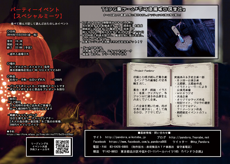 世迷堂 2016/12/10 ともよ出演情報☆ Project-Pandora特別企画 リーディングシアター&イベント クリスマスにアナタにお送りする、黒く切なく美しい物語と、食べて飲んで話して遊ぶパーティーイベント―リーディングシアター【大人の為の黒い童話集】― †演目†【物語の国のお姫様】むかしあるところに『おはなしのくに』があり、そこには『おはなしのくにのお姫様』がおりました。おはなしが大好きなお姫様は毎日いろんな物語を読んでいましたが、ある日言いました。「わたしもお話しを作るほうになりたいわ!」女王様に手伝ってもらい、お話作りのお勉強がはじまりました。男と ― 女魔王と ― 勇者老人と― 青年はたしてお姫様はどんなお話しを作るのでしょうか?おはなしづくりのおはなしは、どんな結末へ向かうのでしょうか?そのおはなしは、どうぞ会場にてお確かめ下さい…お客さま。【サイレントナイト】ある町に、真っ赤な女の子がやってきました。女の子は、自分の先生が書き残した本を探して旅をしておりました。町には、白い男がおりました。男は、女の子と同じ先生の下で学んでいた兄弟子でした。女の子は、兄弟子が持つ先生の本を譲って欲しいと願い出ました。兄弟子はいいました、「1つにつき1人殺してくれたら、君に譲ろう」女の子はいいました、「はい、わかりました」これは、とあるセイヤの物語。白い世界に赤の飛び散る町の物語。〇日時2016年12月23日(金・祝) 1回目 14:30 2回目 18:00・開場は開演の30分前・上演時間70分(予定)・終演後交流時間あり〇場所 レンタルスペース+カフェ 兎亭 東京都練馬区旭丘1-46-12エイケツビルB1〇料金 前売り …2000円 予約・当日…2300円 18才以下 …1000円・パンドラポイントカード対象の公演です・ポイントがたまると景品をプレゼント&割引券になります【割引】・ペア割引 2人同時のお申し込み&ご来場で、お一人様200円づつ割引いたします・リピーター割引 今公演を2回目ご覧の場合、1000円でご覧頂けます―パーティーイベント【スペシャルミーツ】― 食べて飲んで話して遊んぶおたのしみイベント。 ・TRPG風ゲーム『不可侵領域の探索社』 チームを組んで魔道人形に指示をだし、ダンジョンから宝を持ち帰れ・お客様、キャスト、スタッフとのトーク・軽食、おかし、フリードリンク付き〇日時2016年12月23日(金・祝)受付 19:30開始 19:45終了 22:00(予定)・途中入退場OK〇場所 レンタルスペース+カフェ 兎亭 東京都練馬区旭丘1-46-12エイケツビルB1〇料金 前売り・予約・当日いずれも …1200円・パンドラポイントカード対象のイベントです・ポイントがたまると景品をプレゼント&割引券になります【割引】・ペア割引 2人同時のお申し込み&ご来場で、お一人様200円づつ割引いたします・観劇キャッシュバック 当日上演するリーディングシアター【大人の為の黒い童話集】をご覧のお客様、200円キャッシュバック◆予約↓公演&イベントのご予約はコチラ↓https://mailform.mface.jp/frms/shiika777/5x23ra328api◆キャスト茅野奏稲江鮭(Team F☆POT)TOMO升野紗綾香ともよ(レジェンドステージ)やわも青葉彩花原田達也水崎龍磨(総合学園ヒューマンアカデミー新宿校)蝶乃円香(総合学園ヒューマンアカデミー新宿校)恵永明輝(総合学園ヒューマンアカデミー新宿校)光兵衛(A-cube)ギン黒石愛美(國學院大學演劇研究会)島袋光(プロダクション☆A組)矢口航大(総合学園ヒューマンアカデミー新宿校)◆スタッフ原作 Yunomi 作 しいか演出 島崎敦毅企画 Project-Pandora制作 表現集団ATP kazu 横溝大希舞台 七色工房絵 YU-KA ぽん。音響 トライ・サウンド楽曲 聖明人(Telunascoape) 他協力 わくらばあずき 武藤真大印刷 P-BOX・・・・・・-Project-Pandora-伏線と心理が絡んだ舞台劇【パンドラの劇場】の世界観を元に、舞台・音声・朗読・イラスト・音楽・グッズなど、多ジャンルに渡る作品群を生み出していく企画。この企画を開いた時、何が世界に飛び出し、そして残るかは、アナタしだい…―実施済み&予定企画一部―・年2回~公演企画・主題歌、主題曲作成・イラストレーターによる公演用画像・WEBラジオ・交流企画・オリジナルグッズ作成・特別サイト、ブログの運営・オリジナルPV、アニメーション作成・期間限定イベントカフェ・ゲームアプリ開発 など◆連絡・問い合わせ電話・FAX 03-6426-8085郵送 〒142-0053 東京都品川区中延4-21-11パールハイツ105 パンドラ企画メール projectpandora_info@yahoo.co.jpサイト http://pandora.aikotoba.jpブログ http://pandora.7narabe.netツイッター @Atp_PandoraFacebook https://www.facebook.com/p.pandora666 PR