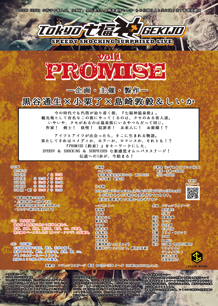 公演 2017/07/10 SAY企画 出演情報☆ Tokyo七福神GEKIJO vol1『PROMISE』~どんな伝説も 始まりは1歩から~ 『LEGEND STAGE』の若手や新人が、小栗了、黒谷通生、島崎敦毅&しいからの仕掛け人と共に送り出す新感覚劇団《Tokyo七福神GEKIJO》 vol1『PROMISE』―あらすじ―今の時代でも汽笛が辿り着く街、『七福神温泉街』。観光地として有名なこの街にやってくるのは、クセのある客人達。いやいや、クセがあるのは温泉街にいるやつらだって同じ。作家! 剣士! 妖怪! 犯罪者! 未来人に! お姫様!?アイツとアイツが出会ったら、そこに生まれる物語。果たしてそれはコメディか、ホラーか、ロマンスか、それとも!?『PROMISE(約束)』をキーワードにした、SPEEDY & SHOCKING & SURPRISED な新感覚オムニバスステージ!伝説への1歩が、今始まる!<☆ 温泉宿編> 温泉宿と温泉宿に向かう列車を舞台に、 作家、女将、仲居、旅行客、駅長、etc、が登場。 現代劇をベースにしたSF(スコシ・フシギ)な短編集。<◇ 時代編> 七福神温泉街の現在、過去、未来を描く。 登場するのは、剣士、少年少女、妖怪、猫、未来人、etc。 バトルにホラーにハートフルと、怒涛のように押し寄せる短編集。―公演概要―○日時 2017年7月 13日(木) / ☆ 19:30 14日(金) ◇ 14:30 / ☆ 19:30 15日(土) ☆ 13:00 / ◇ 18:00 16日(日) ◇ 13:00 / ☆ 18:00 17日(月・祝) ☆ 13:00 / ◇ 18:00 ・開場は開演の30分前 ・上演は約80~90分を予定 ・終演後30分程度の交流時間あり ・☆と◇で演目が変わります○場所 エリア543 東京都杉並区井草5-5-25 西ビルB1F 上井草駅 徒歩2分〇料金(いずれも1ドリンク付き) 前売・予約→3300円 当日→3500円〇予約https://mailform.mface.jp/frms/shiika777/szei22cvcy64―出演者―池尾唯ともよ渡辺みにえ篠原孝文なうみ中村未華犬童琴乃松本暢祐田原沙采佐瀬清隆(アスタリスク)新濱卓(ジャックポット、劇団大富豪)―仕掛け人―《黒谷通生》LEGEND STAGE代表取締役Tokyo七福神GEKIJO主宰、元コンボイハウスプロデューサー。全国で20万人を動員した「THE CONVOY SHOW」の本公演・全国ツアーをはじめ、日本武道館でのコンサート/ディナーショウ等、数多くのプロジェクトに参加。さらなるエンターテインメントの創造を目指しレジェンドステージを設立。《小栗了》NAC代表取締役社長1976年生まれ。1995年、映画監督を目指し渡米。2001年、役者として活動するために帰国し、蜷川幸雄の舞台やスティーヴン・セガール主演の映画などに出演を果たす。2006年、俳優引退と同時にオペラ制作会社のアートクリエーションに入社。2007年、同社からスピンアウトする形で設立されたイベント制作会社NACの取締役に就任。2015年より現職。《島崎敦毅&しいか》オリジナルの演目を中心に活動する演出と脚本のコンビ小劇場やフラットスペースでの公演やイベントを中心にした活動は年間10本、音声作品なら20本、脚本や台本の本数は50を越えることもある。演劇祭等での受賞経験の他、いくつかの脚本の出版経験などを持つ。―スタッフ―企画 レジェンドステージ 黒谷通生 小栗了演出 島崎敦毅脚本 しいか制作 SAY企画舞台 七色工房音響 トライ・サウンド印刷 P-BOX撮影 Bumpkin協力 FISEMAN ENTERTAINMENT アスタリスク ジャックポット 劇団大富豪 表現集団ATP■連絡先■レジェンドステージ電話 03-5777-1128メール info@legendstage.co.jp PR