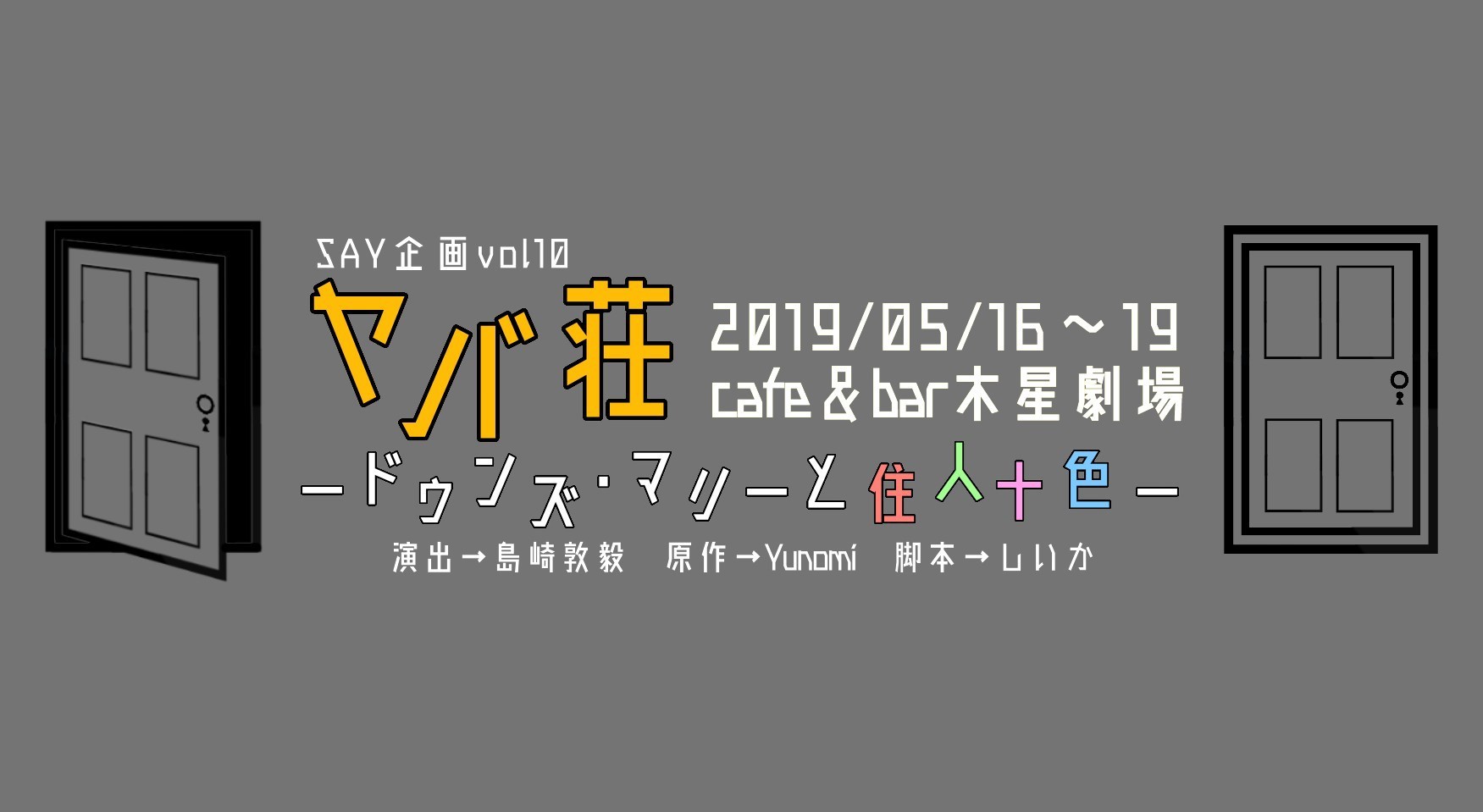 ヤバ荘 2019/02/07 SAY企画vol10 『ヤバ荘 -ドゥンズ・マリーと住人十色-』 SAY企画vol10『ヤバ荘 -ドゥンズ・マリーと住人十色-』 ■あらすじ■ マリーがオーナーを務めるアパートに住む、ヤバそうな奴ら。 年中締め切りに追われる作家とか、 逮捕まで秒読みの青年とか、 アルコールを飲んでないと死んじゃうおっさんとか、 おおよそ普通な奴がいない! だって、ここはヤバ荘! 『ヤバイ!』と思った瞬間、 『時間が欲しい!』と思った瞬間、 世界と時間を超えた『ヤバ荘』への扉が開き、住人となるのだから。 入居の条件は「ヤバイ時」 退去の条件は「何かを決めた時」 ヤバそうな住人の十色な物語を、鼻で笑いながらご覧になりませんか?■公演概要■日時 2019年5月 16日(木) 19:30☆ 17日(金) 15:00★/19:30★ 18日(土) 15:00☆/19:30☆ 19日(日) 12:00☆/16:30★ ・開場は開演の30分前 ・上演は約100分~120分を予定 ・終演後30分程度の交流時間あり ・★と☆はダブルキャストです。 ★=渡辺 みにえ/☆=橋本 明花料金 前売・予約 3200円 当日 3500円 リピーター 2500円 ・ いずれも1ドリンク付き ・リピーターは今公演を2回以降ご観劇の場合の料金です場所 cafe&bar 木星劇場 〒171-0021 東京都豊島区西池袋5-1-5 第二春谷ビルB1予約・販売 https://mailform.mface.jp/frms/shiika777/xm0ktuv8yst3■出演■池尾 唯★渡辺 みにえ白鳥 真理内田 裕康(劇団宇宙キャンパス)☆橋本 明花原 麻綾木暮 匠(劇団天末線)佐瀬 清隆穐谷 実樹山子 奈津子大貫 淳平竹野 希望小林 力横溝 大希★と☆はダブルキャストです。■スタッフ■企画 SAY企画 ヤバ荘制作チーム原作 Yunomi作 しいか演出 島崎 敦毅舞台 七色工房音響 武藤 真大 トライ・サウンド照明 ギン(チームエヌズ)印刷 P-BOX制作 三井 裕子(LACRELICA) 表現集団ATP協力 レジェンドステージ Project-Pandora■SAY企画とは?■SAY企画の特徴をさっとご紹介・アナタの身近に役者と演劇と物語を・現代ベースの物語を、演出方法の違うオムニバスで・カフェやイベントスペースなど一風変わった空間で・お帰りのさいは、明日もがんばれるようなお話をそんなことをイメージして立ち上げたユニット。年2回の活動を目指して、第10回目に突入!■連絡先■メール say_info@yahoo.co.jp(SAY企画)公式ブログ http://say.o-oi.netツイッター @saykikaku