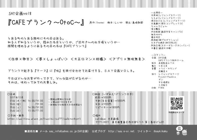 CAFEブランク ~OtoC~ 2017/09/22 SAY企画vol8『CAFEブランク~OtoC~』 SAY企画vol8『CAFEブランク~OtoC~』とある町のとある路地にその店はある。知る人ぞ知るというか、隠れた名店というか、ご近所さんの社交場というか…隙間を埋めるようにあるその店の名は『CAFEブランク』<任侠×激甘><夢×しょっぱい><大正ロマン×柑橘><アプリ×無味無臭>ブランクで起きる『テーマ』に『味』を掛け合わせてお届けする、SAY企画VOL8。今日はどんなお客がやってきて、どんな話が広がるのか…それは、味わってみてのお楽しみ。 ―公演概要―○日時 2017年11月 23日(木・祝) 14:00/19:00 24日(金) /19:00 25日(土) 14:00/19:00 26日(日) 13:00/17:00 ・開場は開演の30分前 ・上演は約110分を予定 ・終演後30分程度の交流時間あり○場所 cafe&bar 木星劇場 〒171-0021 東京都豊島区西池袋5-1-5 第二春谷ビルB1〇料金(いずれも1ドリンク付き) 前売→3000円 予約(当日清算)→3000円 当日→3200円 リピーター→1800円〇予約・販売https://mailform.mface.jp/frms/shiika777/xm0ktuv8yst3―出演者―池尾唯(レジェンドステージ)ともよ(レジェンドステージ)渡辺みにえ(レジェンドステージ)田島謙太(猫舌コンプレックス)ちゃんてじょん清水艦長内田裕康(劇団宇宙キャンパス)椎名ゆかり橋本明花原麻綾(碗プロダクション)たきざわ勝彦(WATERBLUE)阿部志鴻(スターダス・21カンパニー)木暮匠(劇団天末線)―スタッフ―企画 SAY企画 CAFEブランク制作チーム原作 Yunomi脚本 しいか演出 島崎敦毅制作 表現集団ATP舞台 七色工房音響 トライ・サウンド 武藤真大協力 レジェンドステージ Project-Pandora ギン 平古場理生 三井裕子印刷 P-BOX■SAY企画とは?■SAY企画の特徴をさっとご紹介・アナタの身近に役者と演劇と物語を・現代ベースの物語を、演出方法の違うオムニバスで・カフェやイベントスペースなど一風変わった空間で・お帰りのさいは、明日もがんばれるようなお話をそんなことをイメージして立ち上げたユニット。年2回の活動を目指して、第8回目に突入!■連絡先■メール say_info@yahoo.co.jp(SAY企画)公式ブログ http://say.o-oi.netツイッター @saykikaku PR